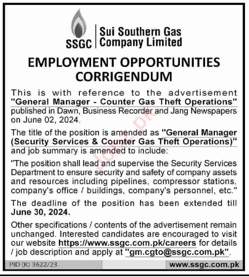 Sui Southern Gas Company Limited SSGC Karachi, karachi Sindh Pakistan invites applications from eligible candidates for the post of general manager as per advertisement of June 16, 2024 published in daily Dawn Newspaper. Preferred Education is Bachelor and Master etc.