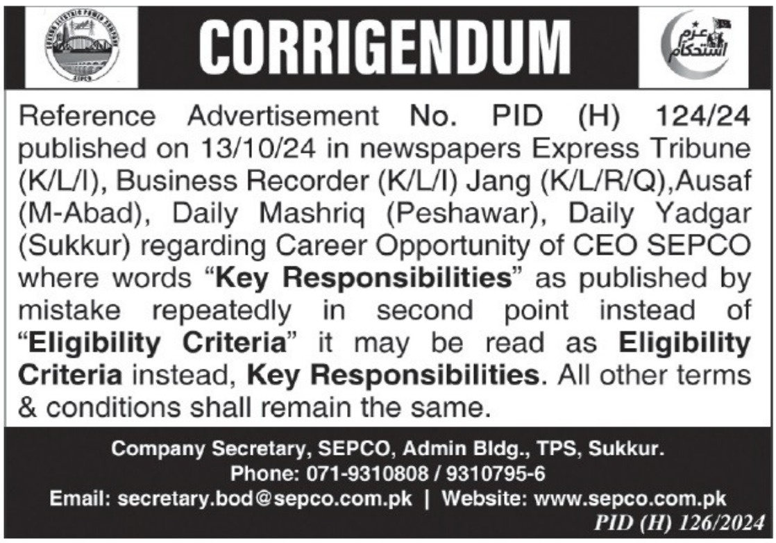 Vacancies in Sukkur Electric Power Company Advertisement October 2024