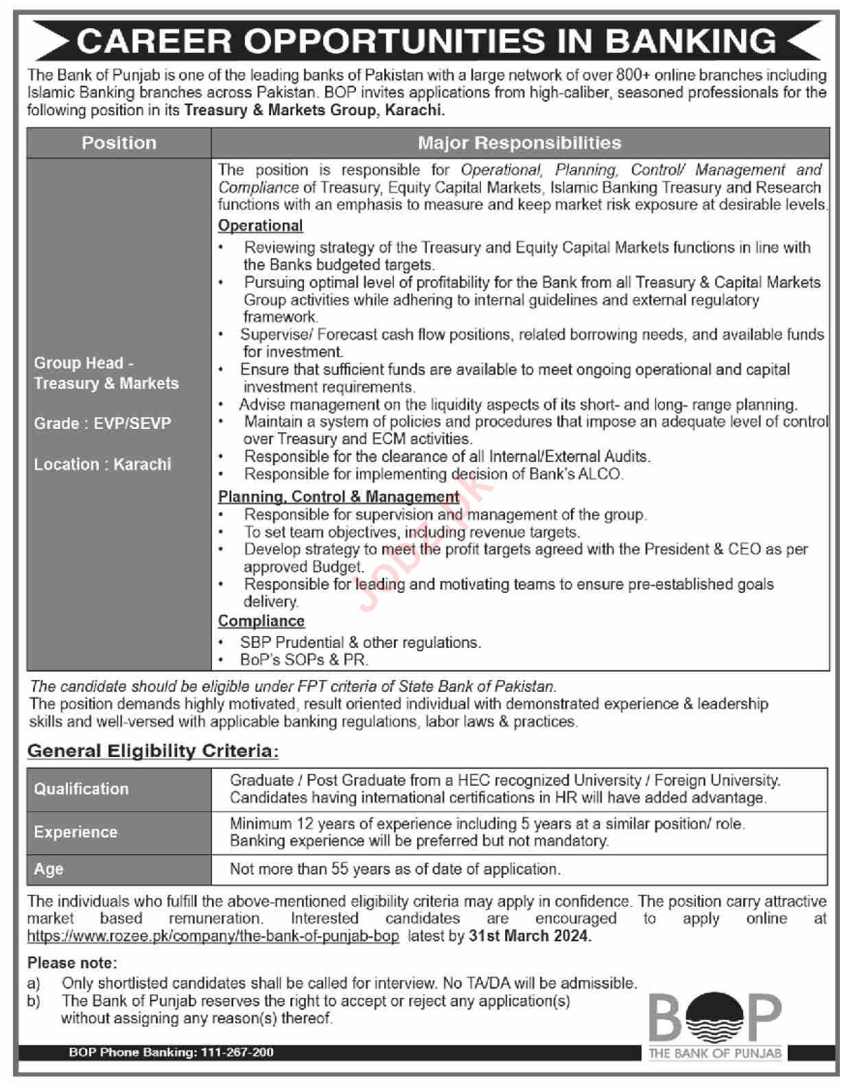 Vacancies in The Bank of Punjab BOP Advertisement March 2024