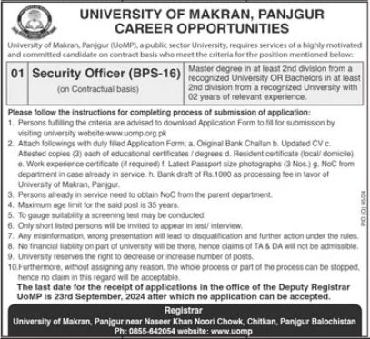 University of Makran latest Government Security jobs and others can be applied till September 23, 2024 or as per closing date in newspaper ad. Read complete ad online to know how to apply on latest University of Makran job opportunities.