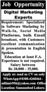 Vacant posts including digital marketing expert are announced in Private Company Lahore, lahore Punjab Pakistan as per 11 December 2022 advertisement in daily Jang Newspaper. Intermediate and Bachelor etc. educational qualification will be preferred.