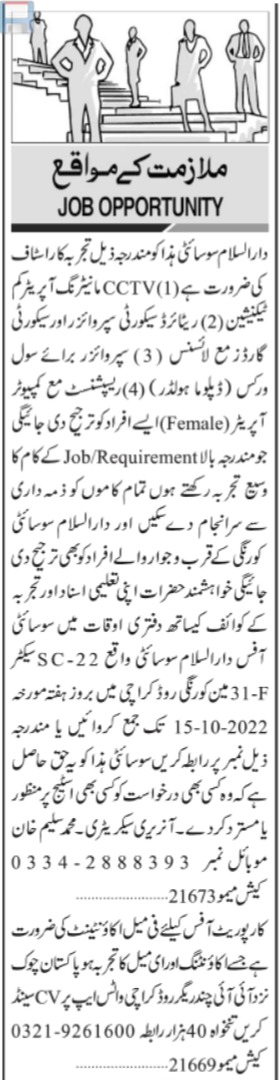 Private Organization is looking for candidates for following posts as per job advertisement published in daily Jang Newspaper of October 12, 2022 for location Karachi, karachi Sindh Pakistan: