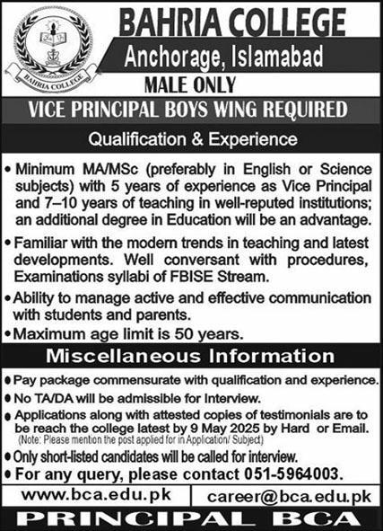 Bahria College is looking for candidates for following posts as per job advertisement published in daily Express Newspaper of April 27, 2025 for location Anchorage Naval Housing scheme Islamabad, islamabad Islamabad Pakistan: