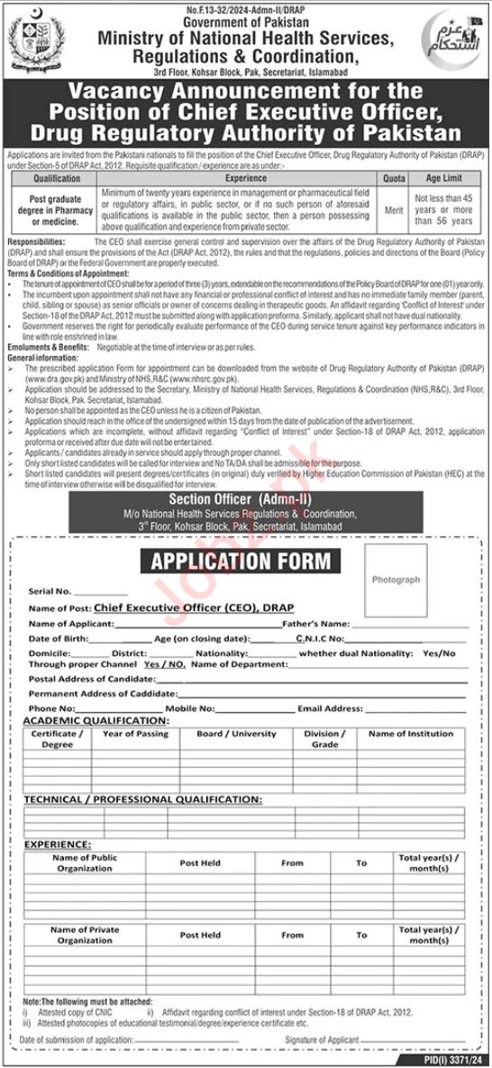 Ministry of National Health Services Regulations & Coordination NHSRC jobs advertisement dated about 17 November 2024 in daily The News Newspaper invites application for the vacant post of chief executive officer in Islamabad, islamabad Islamabad Pakistan. Preferred Education is Master and Bachelor etc.