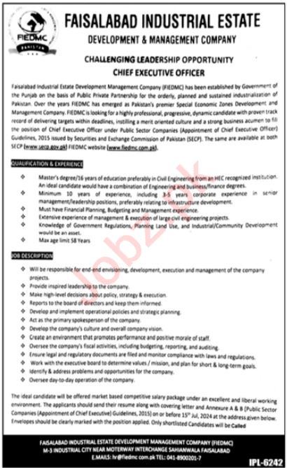 Vacant posts including chief executive officer are announced in Faisalabad Industrial Estate Development & Management Company FIEDMC Lahore, lahore Punjab Pakistan as per 2 July 2024 advertisement in daily Jang Newspaper. Candidates with Master etc. educational background will be preferred.