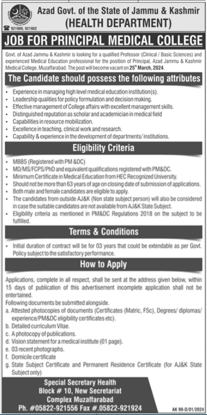 Health Department Muzaffarabad, muzaffarabad AJK Pakistan invites applications from eligible candidates for the post of principal as per advertisement of January 13, 2024 published in daily Jang Newspaper. Candidates with Phd and MBBS etc. educational background will be preferred.