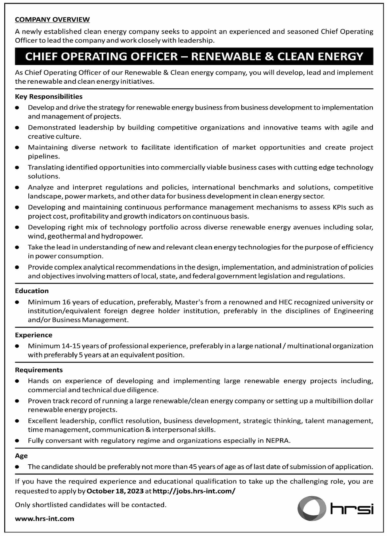 Vacant posts including chief operating officer renewable clean energy are announced in Human Resource Solution International HRSI Karachi, karachi Sindh Pakistan as per 4 October 2023 advertisement in daily Dawn Newspaper. MS and Master etc. educational qualification will be preferred.