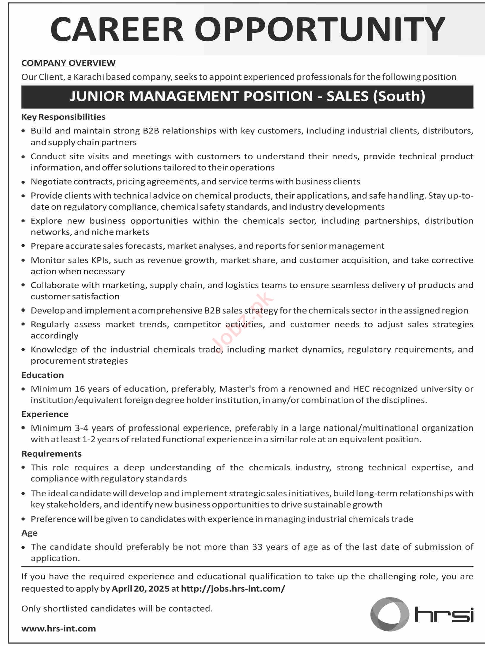 Apply at Human Resource Solution International HRSI latest Private jobs in Sales and departments before closing date which is around April 20, 2025 or as per closing date in newspaper ad. Read complete ad online to know how to apply on latest Human Resource Solution International HRSI job opportunities.