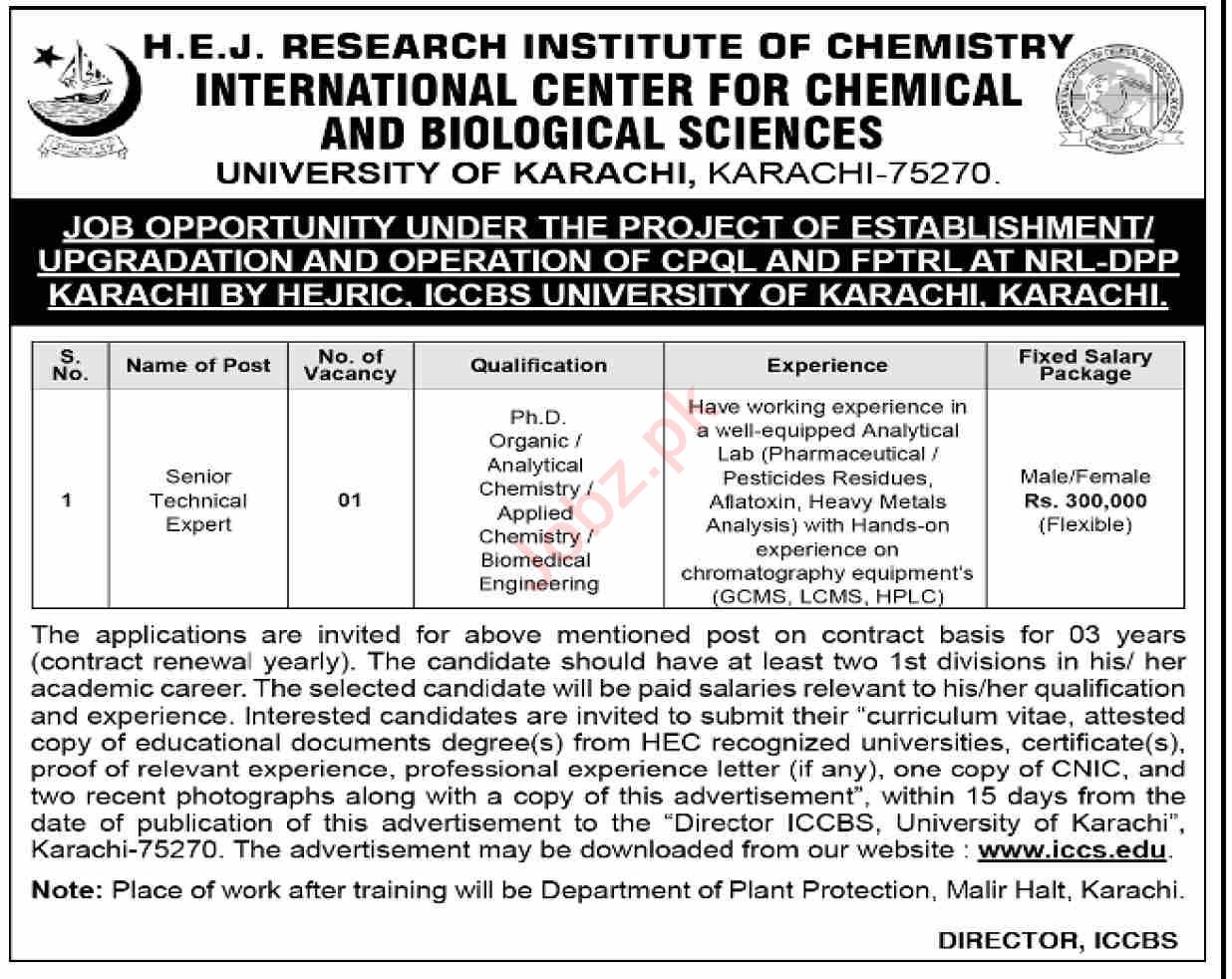 International Center For Chemical & Biological Sciences is looking for candidates for following posts as per job advertisement published in daily Dawn Newspaper of August 3, 2025 for location Karachi, karachi Sindh Pakistan: