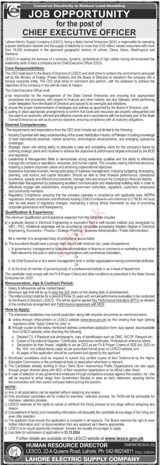 Lahore Electric Supply Company LESCO jobs advertisement dated about 8 December 2024 in daily Express Tribune Newspaper invites application for the vacant post of chief executive officer in Lahore, lahore Punjab Pakistan. Persons with Master and Bachelor etc. education can apply.