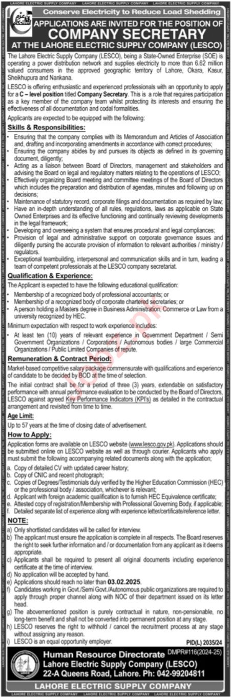 Vacant posts including company secretary are announced in Lahore Electric Supply Company LESCO Lahore, lahore Punjab Pakistan as per 19 January 2025 advertisement in daily Dunya Newspaper. Persons with ACCA and CA etc. education can apply.