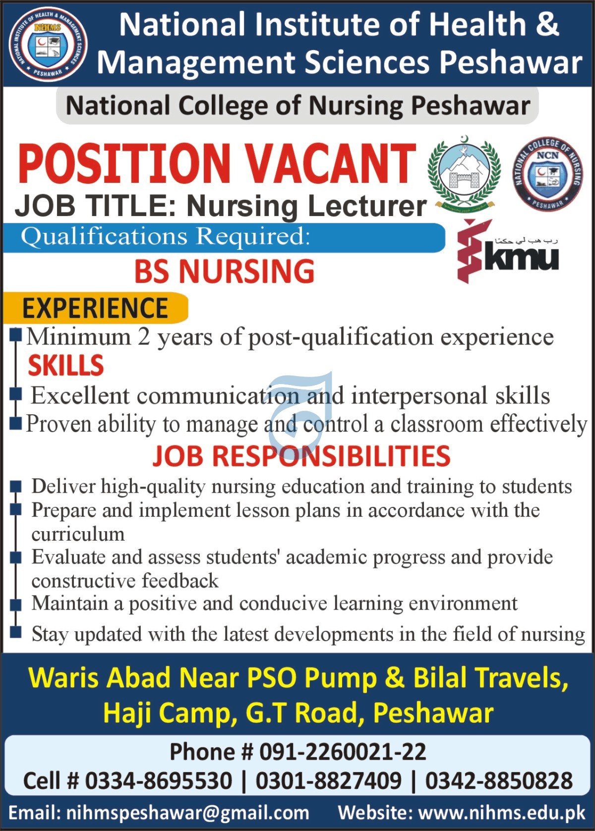Vacant posts including nursing lecturer are announced in National Institute of Health & Management Sciences Peshawar, peshawar Khyber Pakhtunkhwa KPK Pakistan as per 28 August 2024 advertisement in daily Aaj Newspaper. Persons with etc. education can apply.