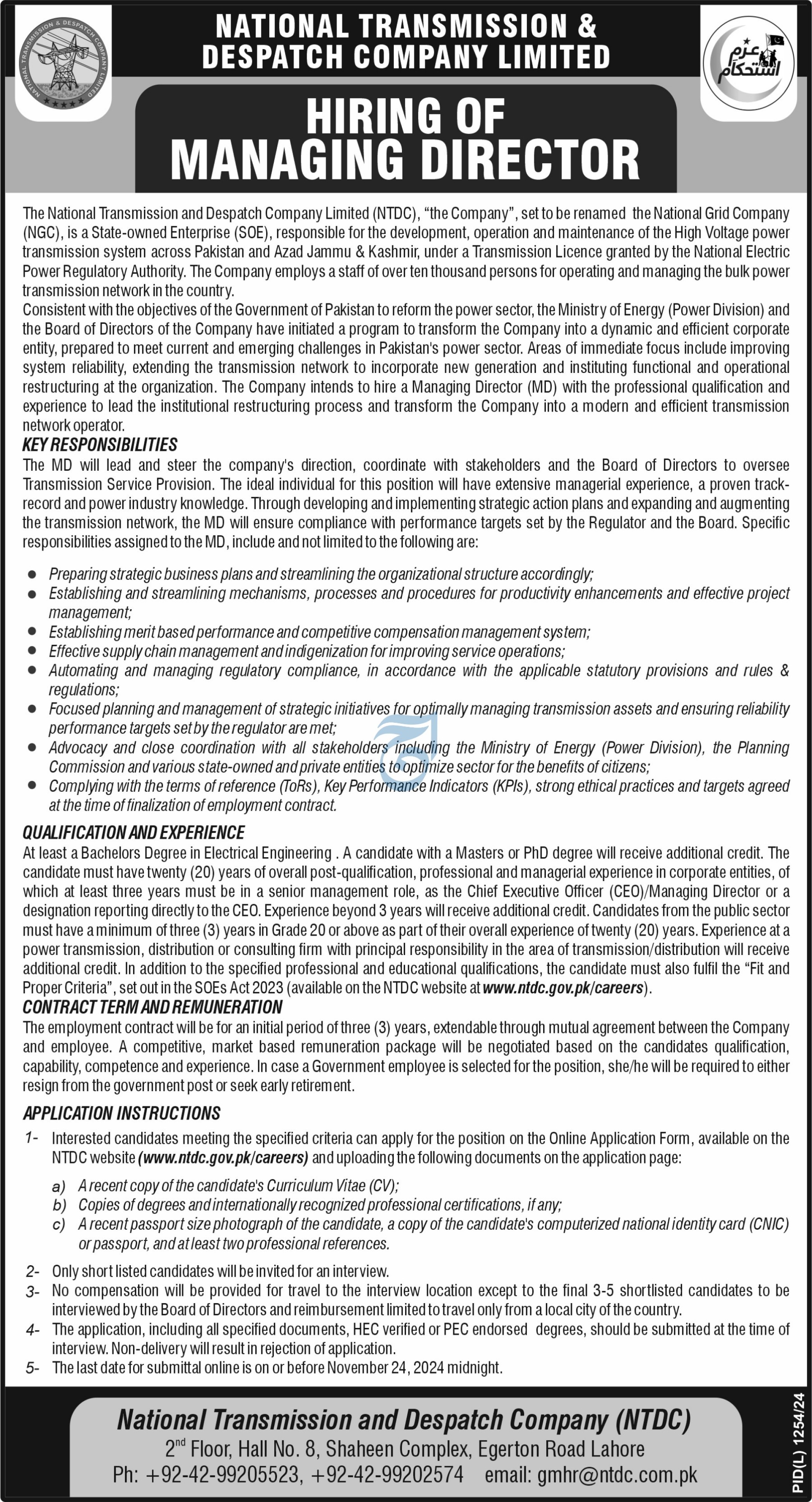 National Transmission & Despatch Company NTDC jobs advertisement dated about 6 November 2024 in daily Aaj Newspaper invites application for the vacant post of managing director in Lahore, lahore Punjab Pakistan. Persons with Master and Bachelor etc. education can apply.