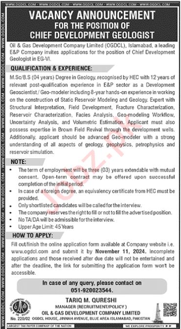 Oil & Gas Development Company Limited OGDCL is looking for candidates for following posts as per job advertisement published in daily Jang Newspaper of October 27, 2024 for location Islamabad, islamabad Islamabad Pakistan: