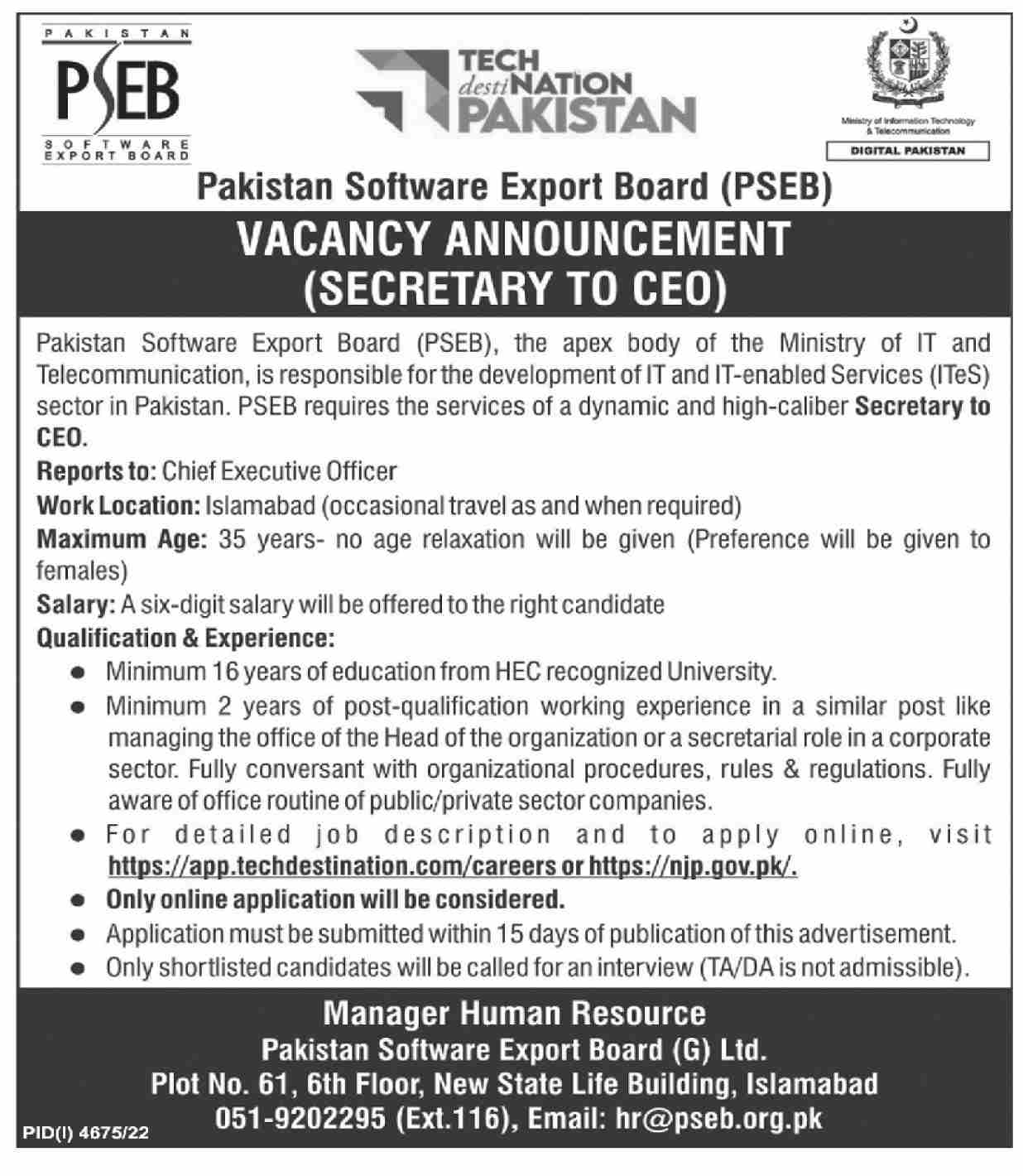 Latest Pakistan Software Export Board PSEB Secretarial Posts Islamabad 2025