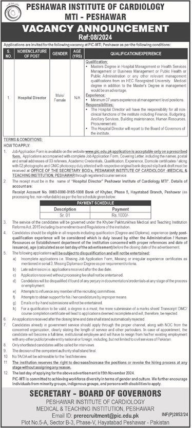 Apply at Peshawar Institute of Cardiology PIC latest Government jobs in Management and departments before closing date which is around November 15, 2024 or as per closing date in newspaper ad. Read complete ad online to know how to apply on latest Peshawar Institute of Cardiology PIC job opportunities.