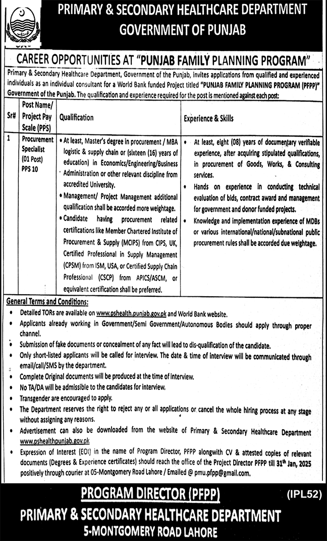 Primary & Secondary Healthcare Department Lahore, lahore Punjab Pakistan invites applications from eligible candidates for the post of procurement specialist as per advertisement of January 8, 2025 published in daily Nawaiwaqt Newspaper. Educational qualifications required Master and MBA etc.
