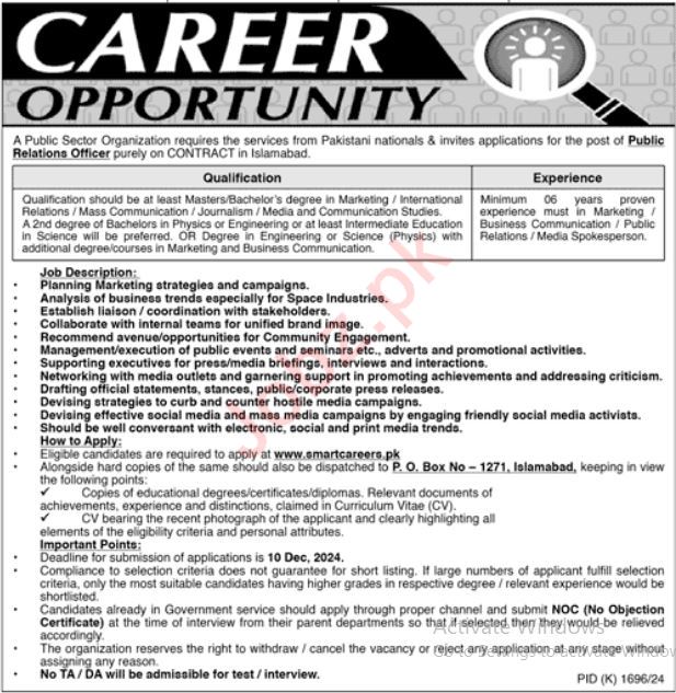 Public Sector Organization is looking for candidates for following posts as per job advertisement published in daily The News Newspaper of December 1, 2024 for location Islamabad, islamabad Islamabad Pakistan:
