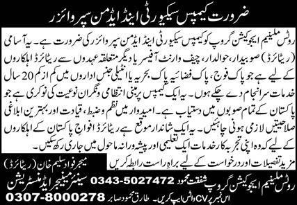 Roots Millennium Schools Lahore, lahore Punjab Pakistan invites applications from eligible candidates for the post of security admin supervisor as per advertisement of August 24, 2025 published in daily Express Newspaper. Bachelor etc. educational qualification will be preferred.