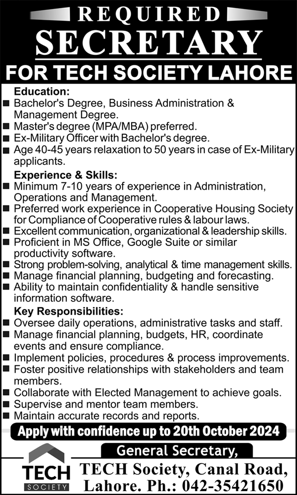 Housing Society jobs advertisement dated about 6 October 2024 in daily Nawaiwaqt Newspaper invites application for the vacant post of secretary in Lahore, lahore Punjab Pakistan. Preferred Education is Master and Bachelor etc.