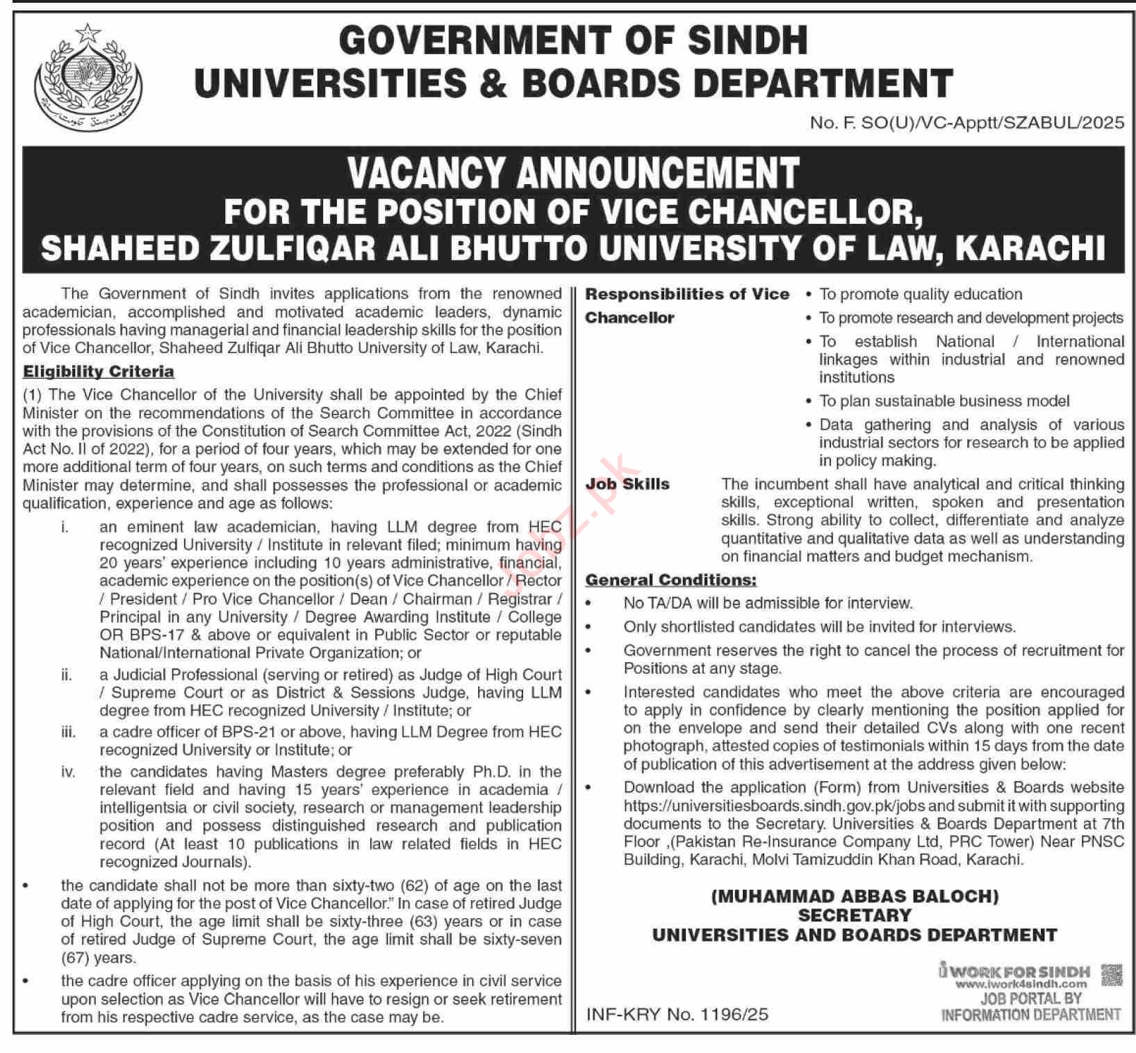 Universities & Boards Department jobs advertisement dated about 20 April 2025 in daily Dawn Newspaper invites application for the vacant post of vice chancellor in Karachi, karachi Sindh Pakistan. Candidates with LLM and Master etc. educational background will be preferred.