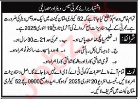 Pakistan Army jobs advertisement dated about 19 January 2025 in daily Nawaiwaqt Newspaper invites application for the vacant post of mess waiter and masalchi in Multan, multan Punjab Pakistan. Persons with Primary etc. education can apply.