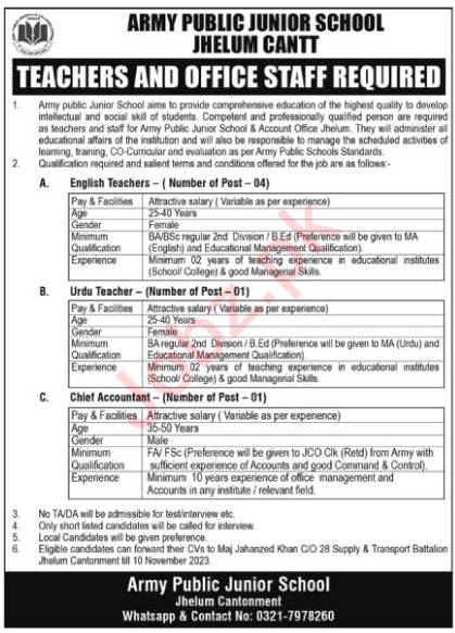 Army Public School APS jobs advertisement dated about 6 November 2023 in daily Nation Newspaper invites application for the vacant post of chief accountant, english teacher and urdu teacher in Jhelum, jhelum Punjab Pakistan. Persons with BA, B.ed and Intermediate etc. education can apply.