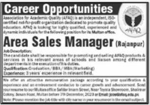Association for Academic Quality AFAQ Rajanpur, rajanpur Punjab Pakistan invites applications from eligible candidates for the post of area sales manager as per advertisement of December 4, 2023 published in daily Khabrain Newspaper. Educational qualifications required Bachelor, MBA and BBA etc.