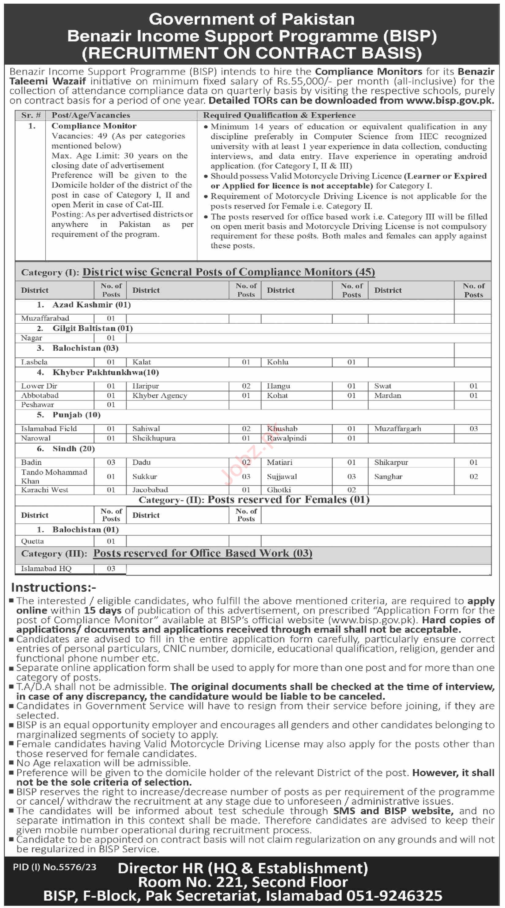Vacancies in Benazir Income Support Programme BISP Advertisement March 2024