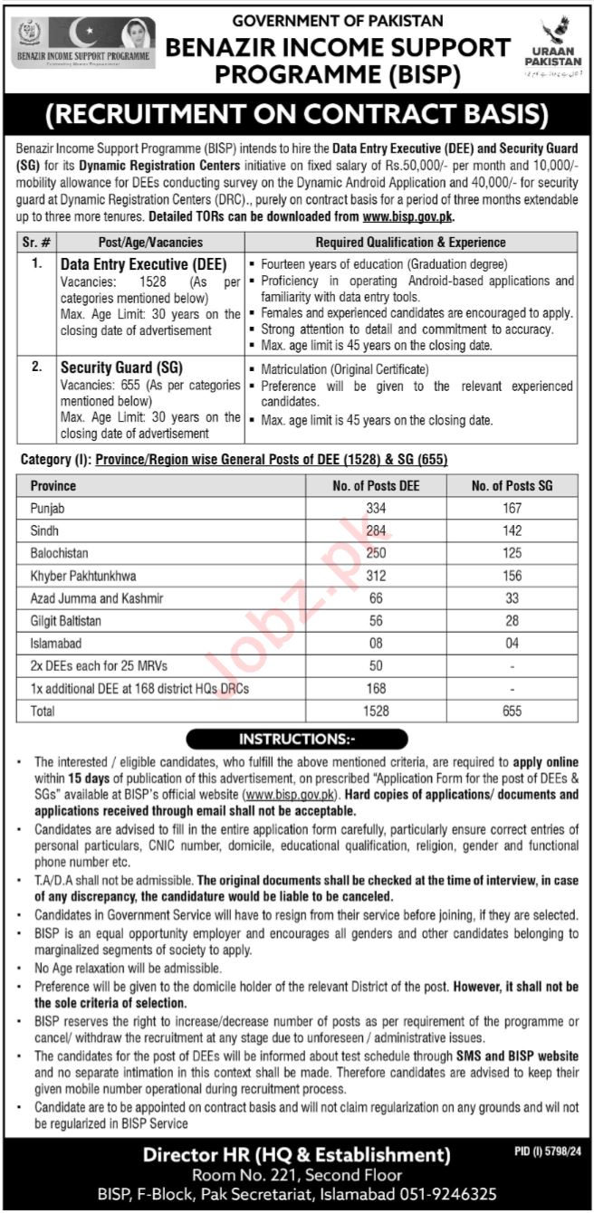 Benazir Income Support Programme BISP jobs advertisement dated about 23 February 2025 in daily Express Tribune Newspaper invites application for the vacant post of security guard and data entry executive in Islamabad, islamabad Islamabad Pakistan. Preferred Education is Bachelor and Matric etc.