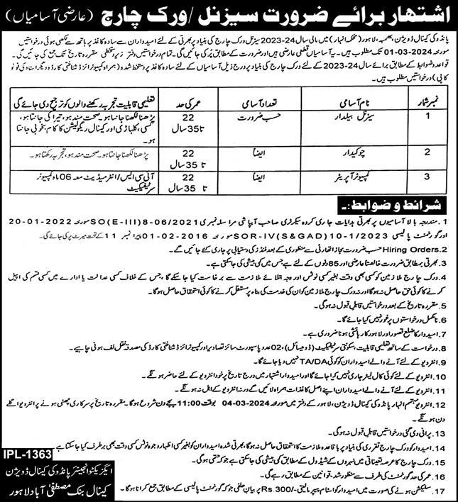 Job Positions At Canal Division Lahore