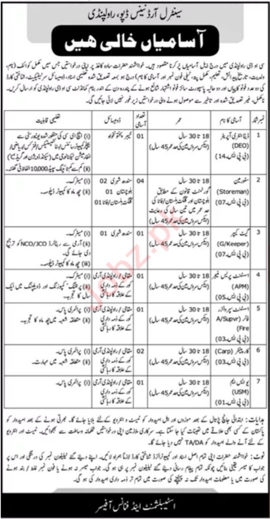Vacant posts including storeman, assistant supervisor fire, assistant press manager apm, gate keeper, data entry operator deo, carpenter and usm are announced in Central Ordnance Depot COD Rawalpindi, rawalpindi Punjab Pakistan as per 15 January 2023 advertisement in daily Dunya Newspaper. Educational qualifications required Matric, Bachelor and Primary etc.