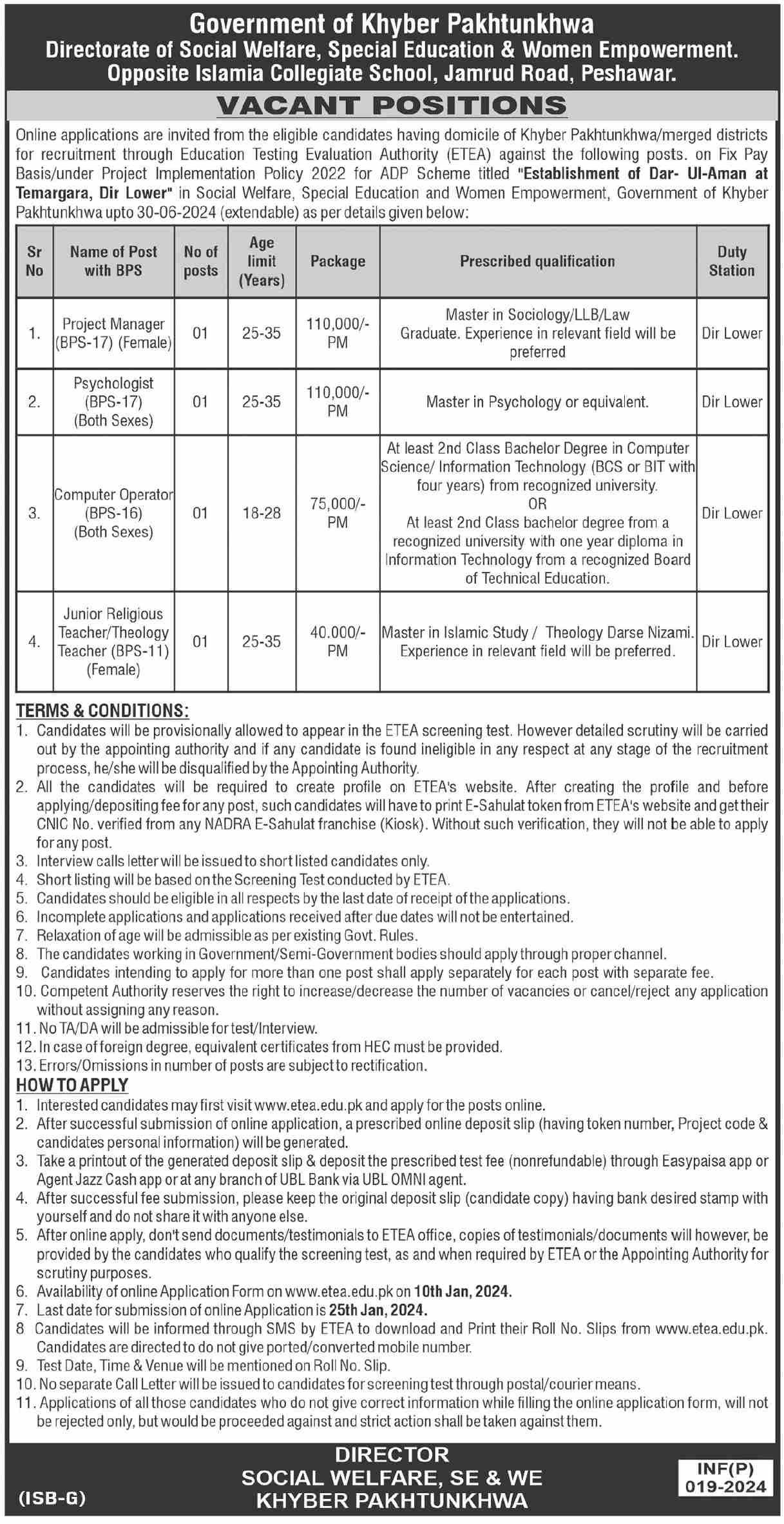 Latest Government jobs in Social Welfare & Special Education & Women Empowerment in Management and others can be applied till 25 January 2024 or as per closing date in newspaper ad. Read complete ad online via ETEA to know how to apply on latest Social Welfare & Special Education & Women Empowerment job opportunities.