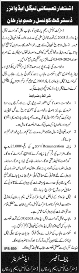 District Council jobs advertisement dated about 20 August 2024 in daily Jang Newspaper invites application for the vacant post of legal advisor in Rahim Yar Khan, rahim yar khan Punjab Pakistan. Preferred Education is LLb and Bachelor etc.