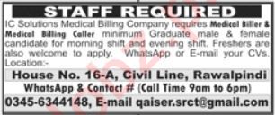 Vacant posts including medical biller and medical billing caller are announced in IC Solutions Medical Billing Company Rawalpindi, rawalpindi Punjab Pakistan as per 29 December 2024 advertisement in daily Jang Newspaper. Persons with Bachelor etc. education can apply.