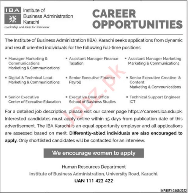 Institute of Business Administration IBA Karachi, karachi Sindh Pakistan invites applications from eligible candidates for the post of assistant manager finance taxation, executive, executive dean office, executive finance payroll, manager marketing communication, assistant manager marketing, executive creative content, digital technical lead and technical support engineer as per advertisement of August 28, 2022 published in daily Jang Newspaper. Preferred Education is Others, Bachelor and Master etc.