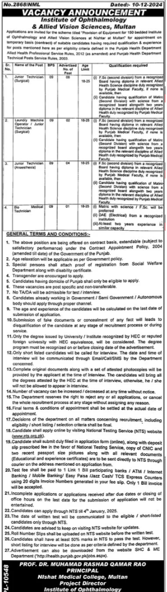 Vacancies in Nishat Medical College Advertisement December 2024