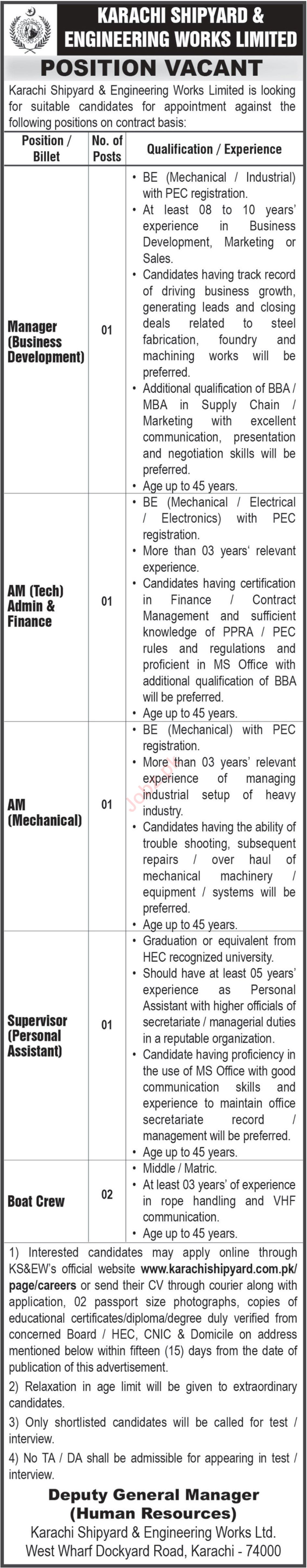 Karachi Shipyard and Engineering Works Limited is looking for candidates for following posts as per job advertisement published in daily Express Tribune Newspaper of November 3, 2024 for location Karachi, karachi Sindh Pakistan: