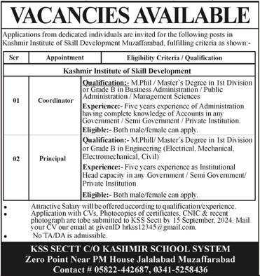 Vacant posts including principal and coordinator are announced in Kashmir School System Muzaffarabad, muzaffarabad AJK Pakistan as per 4 September 2024 advertisement in daily Mahasib Newspaper. Persons with Master and Mphil etc. education can apply.