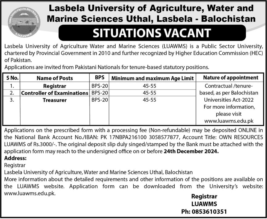 Vacant posts including controller of examinations, registrar and treasurer are announced in Lasbela University of Agriculture Water and Marine Sciences Lasbela, lasbela Balochistan Pakistan as per 4 December 2024 advertisement in daily Other Newspaper. Mphil, MS, Phd and Master etc. educational qualification will be preferred.