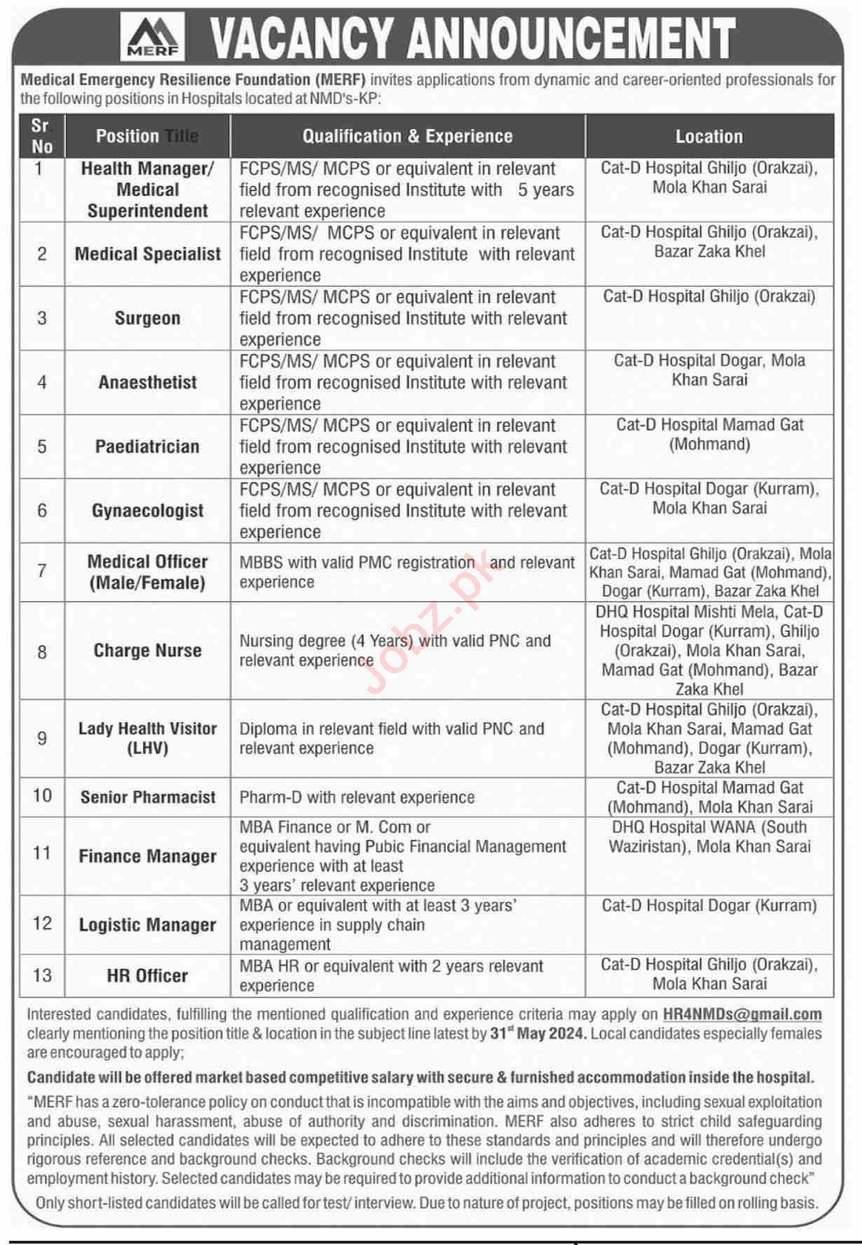 Medical Emergency Resilience Foundation MERF invites applications for job positions advertised in daily Dawn dated 21 April 2024 for following vacancies in Orakzai, kurram, mohmand and orakzai Khyber Pakhtunkhwa KPK Pakistan.