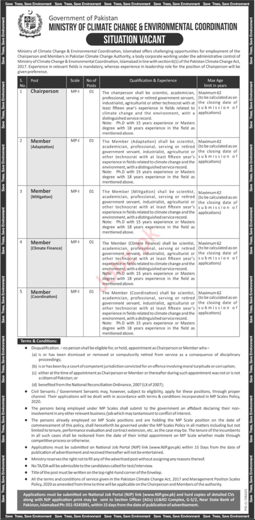 Vacant posts including member adaptation, member coordination, member climate finance, member mitigation and chairperson are announced in Ministry of Climate Change Islamabad, islamabad Islamabad Pakistan as per 26 May 2024 advertisement in daily Jang Newspaper. Candidates with CA, Master, ACCA and Bachelor etc. educational background will be preferred.