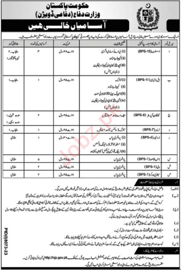 Vacant posts including tracer, assistant, telephone operator, driver, ldc, sanitary worker, mali and naib qasid are announced in Ministry of Defence Islamabad, islamabad Islamabad Pakistan as per 30 June 2024 advertisement in daily Nawaiwaqt Newspaper. Candidates with BA, Primary, Intermediate and Matric etc. educational background will be preferred.