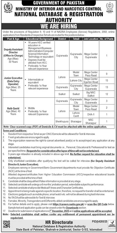 National Database & Registration Authority NADRA latest Government Management jobs and others can be applied till 7 December 2025 or as per closing date in newspaper ad. Read complete ad online to know how to apply on latest National Database & Registration Authority NADRA job opportunities.