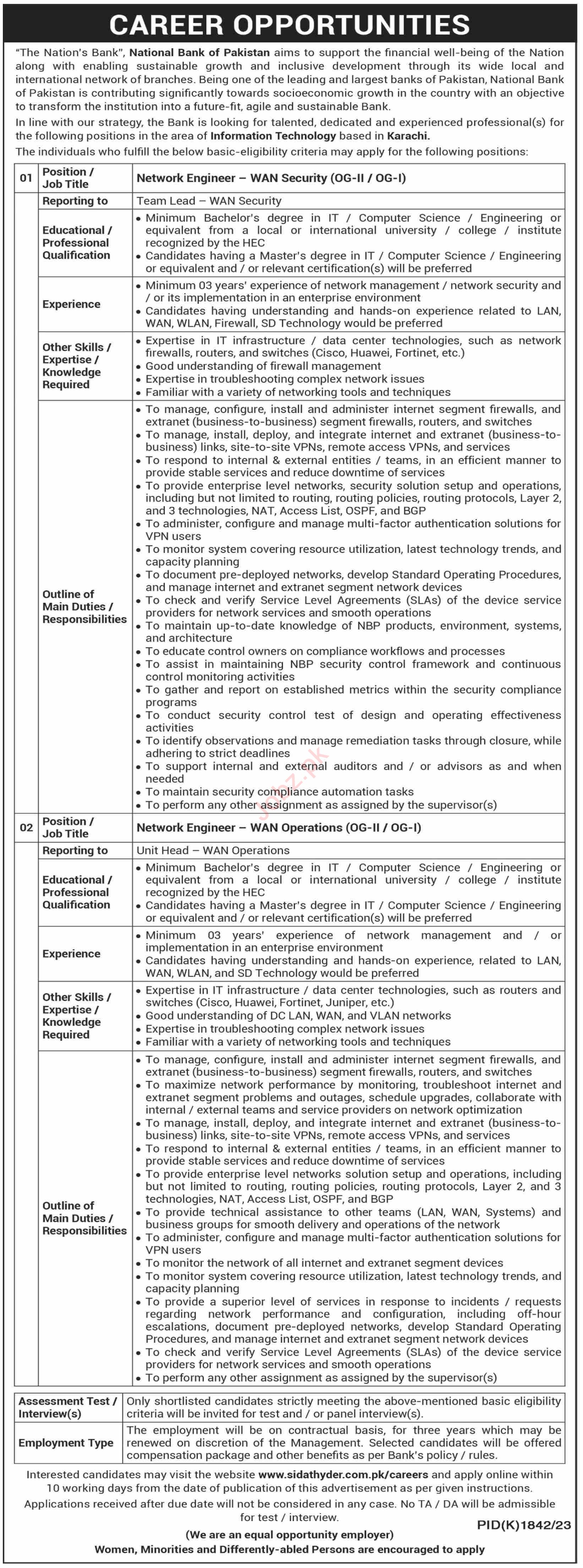 Vacant posts including network engineer wan operations and network engineer wan security are announced in National Bank of Pakistan NBP Karachi, karachi Sindh Pakistan as per 24 December 2023 advertisement in daily Dawn Newspaper. Preferred Education is BIT, Bachelor, BCS and B.E etc.