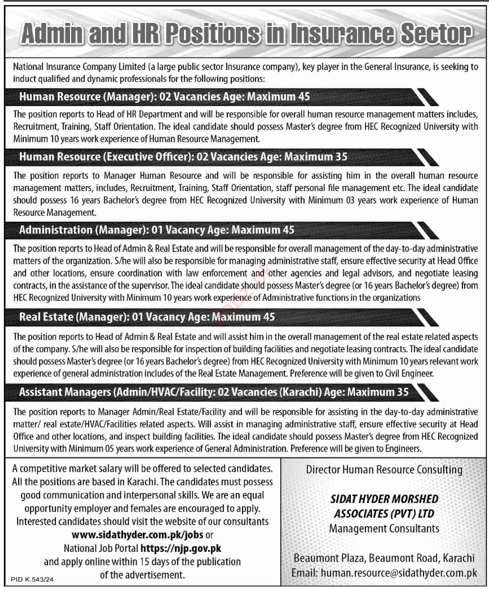 Vacant posts including administration manager, human resource executive officer, assistant manager admin, assistant manager hvac, assistant manager facility, real estate manager and human resource manager are announced in National Insurance Company Limited NICL Karachi, karachi Sindh Pakistan as per 25 August 2024 advertisement in daily Dawn Newspaper. Preferred Education is Bachelor and Master etc.