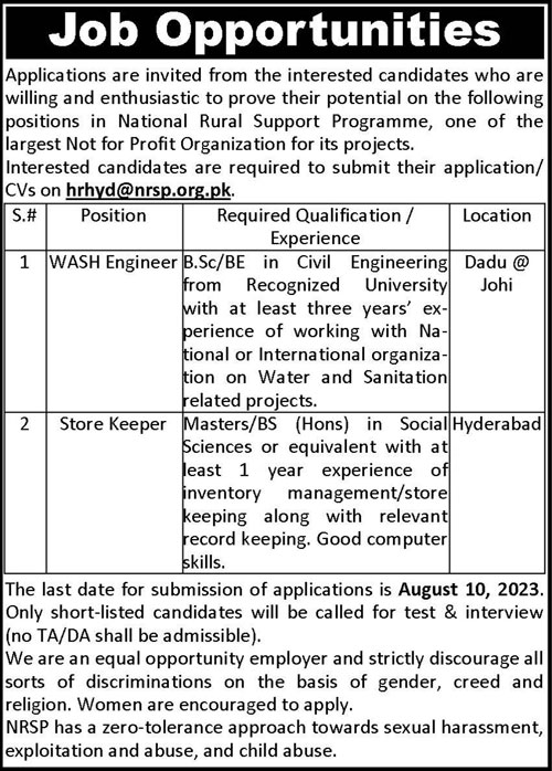 National Rural Support Programme NRSP is looking for candidates for following posts as per job advertisement published in daily Kawish Newspaper of August 7, 2023 for location Dadu, dadu and hyderabad Sindh Pakistan: