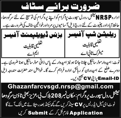 National Rural Support Programme NRSP jobs advertisement dated about 31 October 2023 in daily Express Newspaper invites application for the vacant post of relationship officer and business development officer in Sargodha, chiniot, hafizabad and sargodha Punjab Pakistan. Matric, Bachelor, BA, MA and Intermediate etc. educational qualification will be preferred.