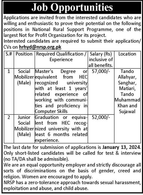 National Rural Support Programme NRSP jobs advertisement dated about 10 January 2024 in daily Kawish Newspaper invites application for the vacant post of male social mobilizer in Tando Allahyar, sujawal, tando muhammad khan, sanghar, matiari and tando allahyar Sindh Pakistan. Candidates with Bachelor and Master etc. educational background will be preferred.