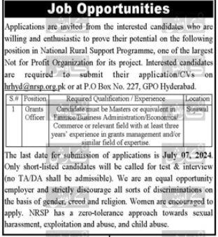 National Rural Support Programme NRSP jobs advertisement dated about 3 July 2024 in daily Kawish Newspaper invites application for the vacant post of grants officer in Sujawal, sujawal Sindh Pakistan. Persons with Master etc. education can apply.